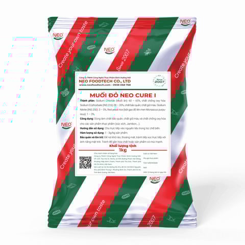 Muối Đỏ Neo Cure 1 là phụ gia chuyên dụng giúp tạo màu đỏ hồng tự nhiên, giữ màu ổn định và tăng tính thẩm mỹ cho các sản phẩm thịt chế biến.