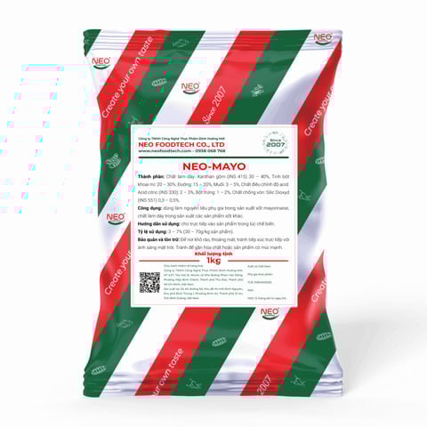 Neo Mayo là phụ gia chuyên dụng, dùng làm nguyên liệu trong sản xuất xốt mayonnaise và chất làm dày trong các loại xốt khác. Sản phẩm giúp thành phẩm đạt độ sánh, đồng đều và ổn định trong suốt quá trình sản xuất.